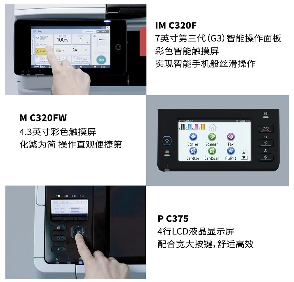 IM C320F和M C320FW分(fēn)别搭載7英寸和4.3英寸彩色智能(néng)觸摸屏,可(kě)在面闆上實現智能(néng)手機般絲滑直觀的操作(zuò),化繁為(wèi)簡,新(xīn)手也能(néng)秒(miǎo)上手。P C375配有(yǒu)4行LCD屏幕,配合全新(xīn)設計的寬大按鍵,舒适高效。