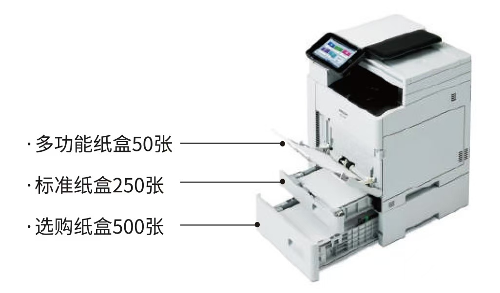 為(wèi)應對海量文(wén)印任務(wù)的連續輸出,理(lǐ)光1M C320F系列的小(xiǎo)身材有(yǒu)着“大肚量”。主機标準的進紙容量為(wèi)300張(标準紙盒250張+多(duō)功能(néng)紙盒50張)。另外,通過安(ān)裝(zhuāng)紙盒選購(gòu)件PB1210,IM C320F和M C320FW可(kě)實現800張的大容量供紙,而P C375更可(kě)達到1300張超大容量進紙。海量供紙徹底告别頻繁換紙與等待!